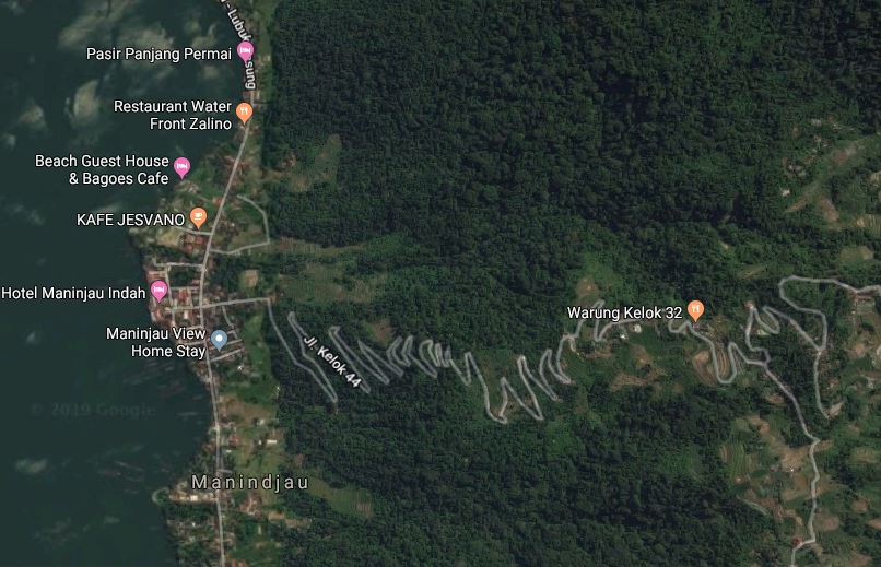 Pero la aventura más peligrosa de todo nuestro periplo la vivimos en el lago Maninjau. Aún no he terminado de entender qué diablos pasó, o nos pasó. El lago Maninjau, al igual que el Toba es un cráter de un enorme volcán cuyo fondo se ha llenado de agua. La altura de las paredes internas es de 600 mts., o sea una inclinación muy respetable. La guía decía que había que pillar un minibus desde la estación de Bukittinggi hasta la aldea de Lawang. Desde allí había un camino que te conducía tras cuatro kilómetros andando entre cafetales hasta el borde mismo del volcán desde donde había un camino, llamado el de Camino de los 44 recodos que te llevaba en dos horas hasta el borde del lago, al pueblecito del mismo nombre que el lago, Manunjau.