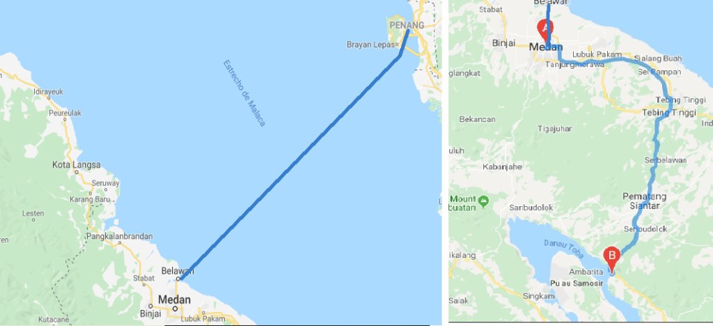 Llegados al puerto de Belawan, un bus que iba incluido en el precio del pasaje nos llevó a la capital, Medan. Nada más bajar del bus nos asaltó a los occidentales una avalancha de taxistas que ofrecían traslado a los usuales puntos de destino, al lago Toba unos y a Berastagi, paraíso del rafting y del turismo de orangutanes, otros. Ante la insistencia inmisericorde de los taxistas cargamos nuestras mochilas y anduvimos un centenar de metros hasta que dejamos de verlos. Entonces paramos un ciclorickshow que en media hora nos dejó en la estación central de autobuses.
